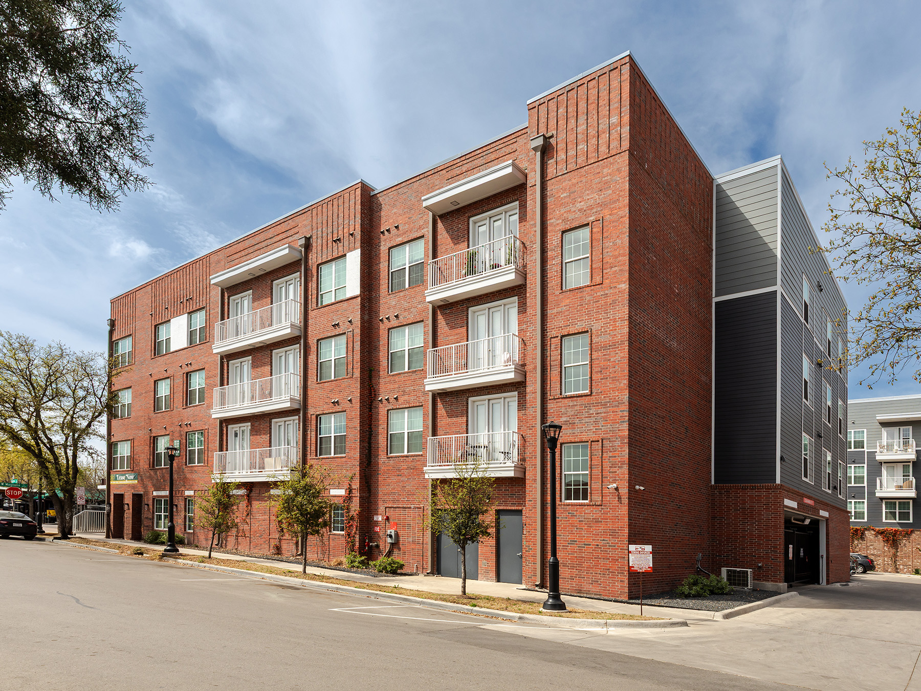 This modern infill project features three stories of studio and one-bedroom residences above ground-floor retail, with parking discreetly placed behind the building. Designed in accordance with the Near Southside Development Standards, it meets height, parking, and easement requirements while embracing input from the local community. Notably, the preservation of a beloved tree, affectionately known as the “Dr. Seuss tree,” prompted the design team to divide the structure into two distinct volumes. This approach reduces visual massing along the street and enhances architectural interest.