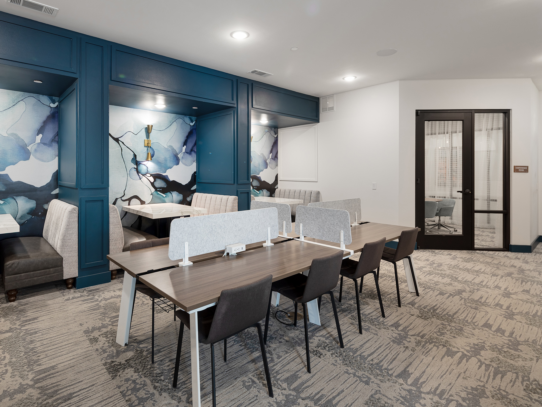 The clubhouse and leasing center anchor the community, serving as a hub for activity and connection. Inside, residents find a welcoming great room for gatherings, a business center with conference room and fitness center.