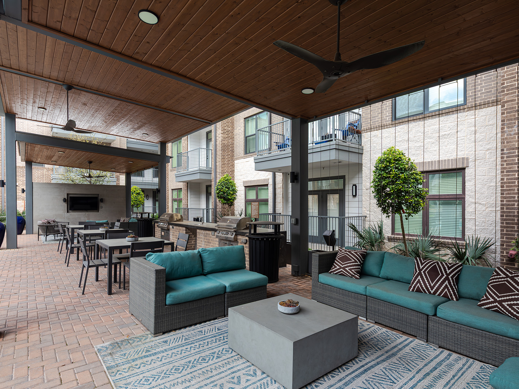 Landscaped courtyards are spread throughout the community, each thoughtfully programmed to provide distinct experiences. Lenox Maplewood features two resort-style pools nestled within these outdoor spaces, as well as shaded cabanas, fire pit lounges, and generous pool decks. The entire site was designed to become a walkable neighborhood, with intuitive circulation, pedestrian-friendly pathways, and a sense of cohesion that ties the two phases together.