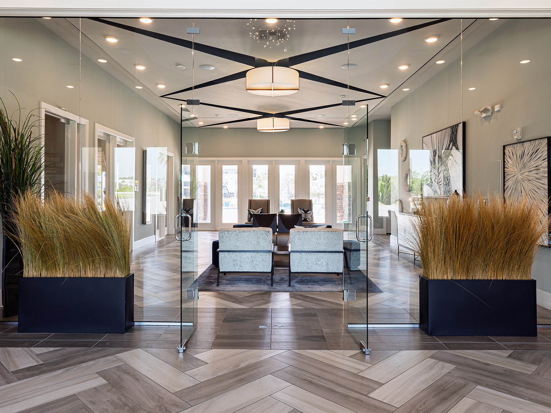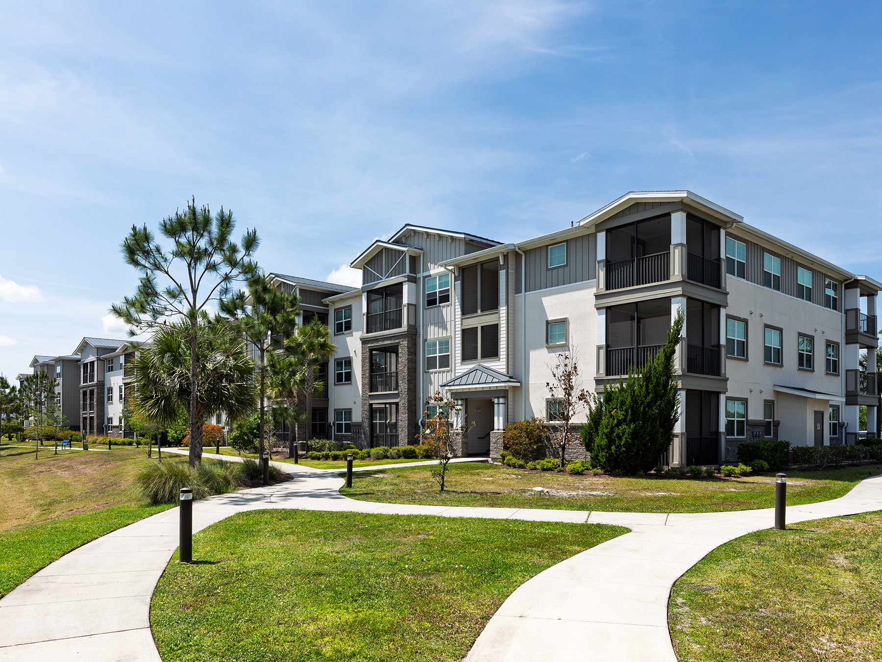 Luminary at 95 is a multifamily community designed to evoke the feeling of a tropical resort. Located near Interstate 95 in West Melbourne, the community’s layout was carefully developed around a central retention pond, a design challenge intensified by the multiple preserved wetlands present on site. The result is a naturalistic site plan, with every building positioned to border either the retention pond or protected wetland areas.