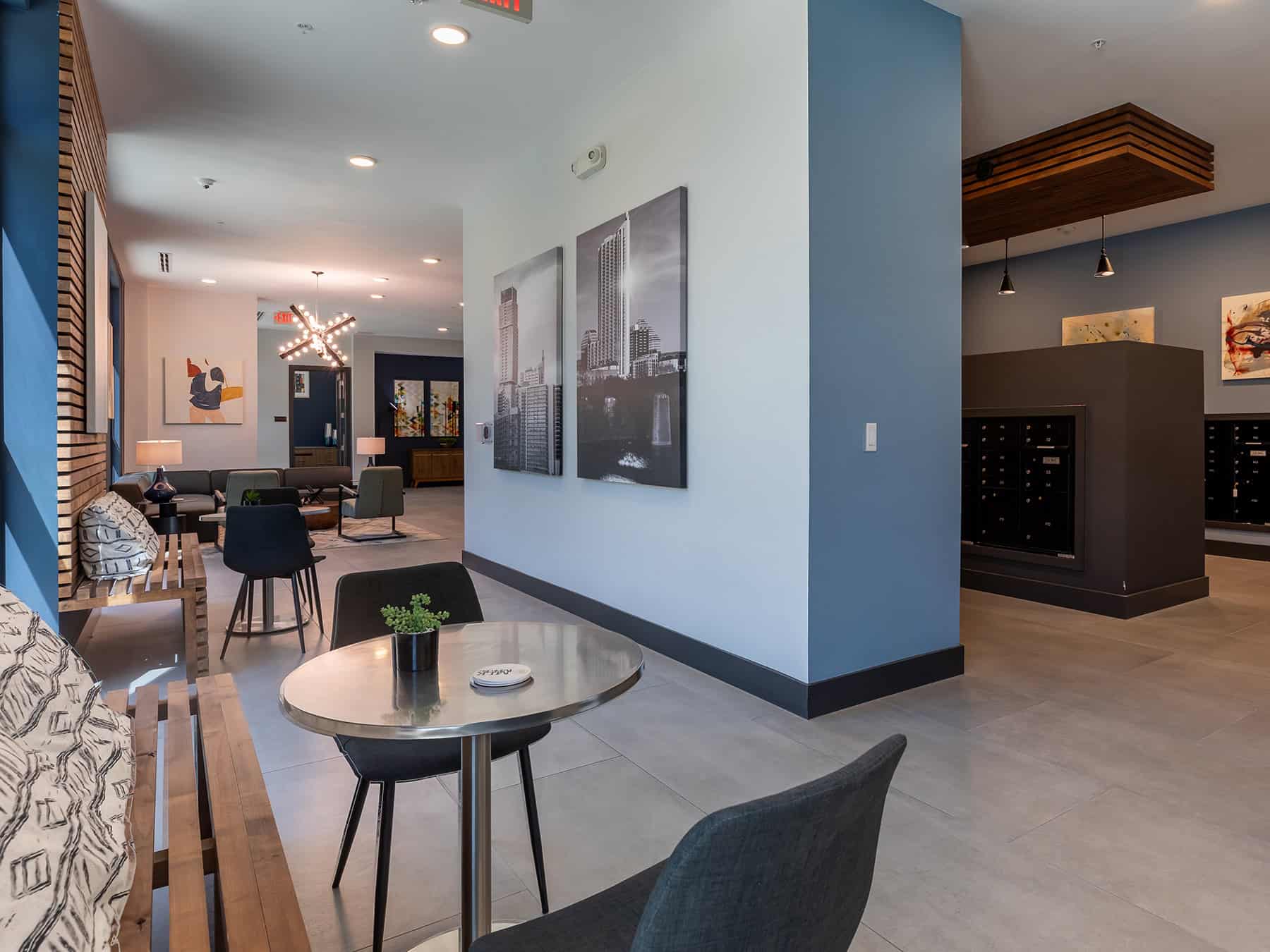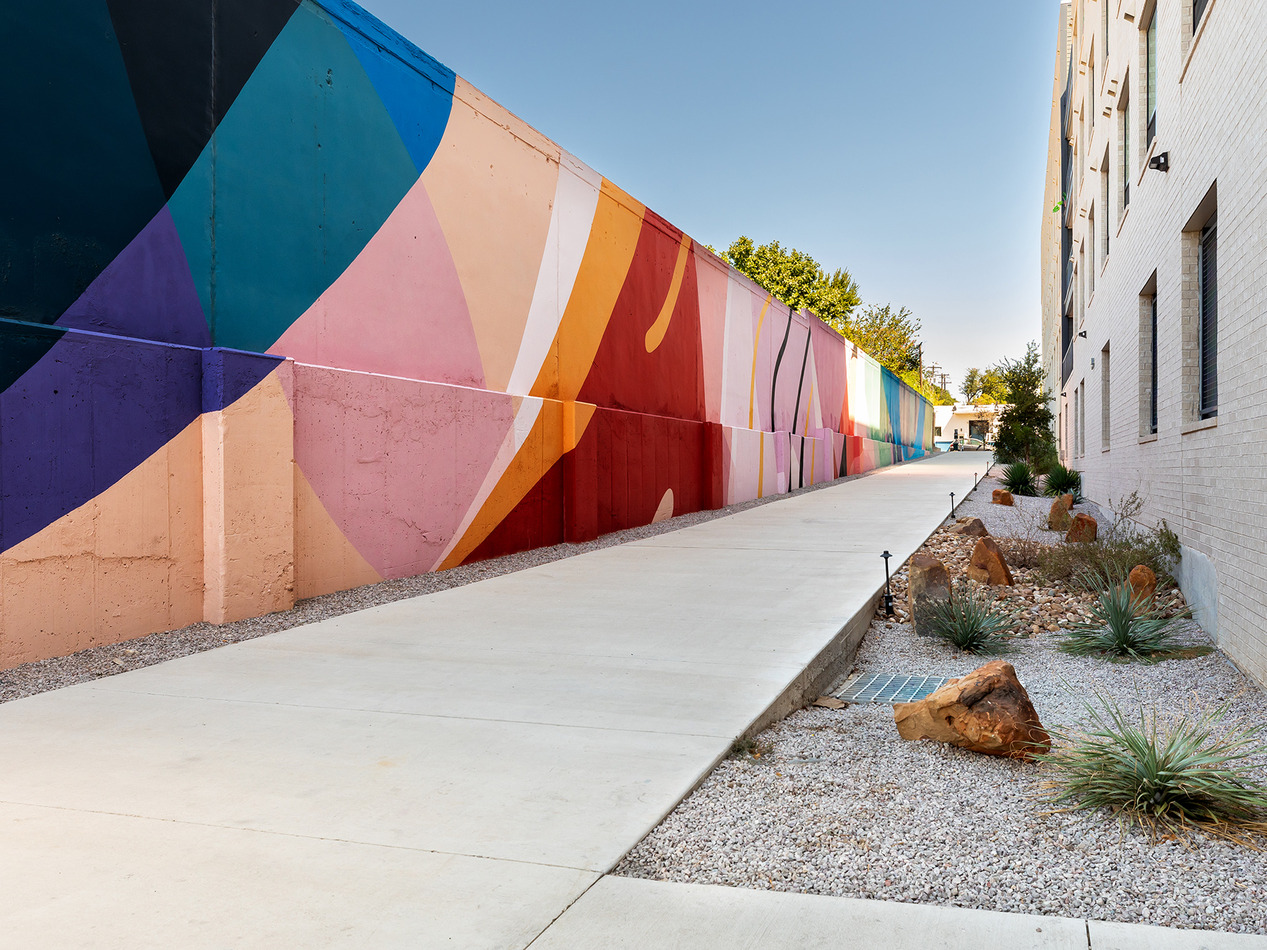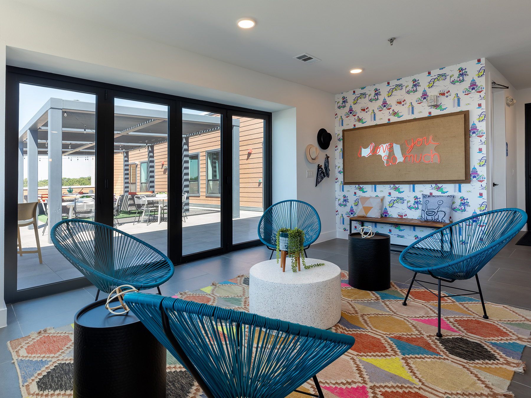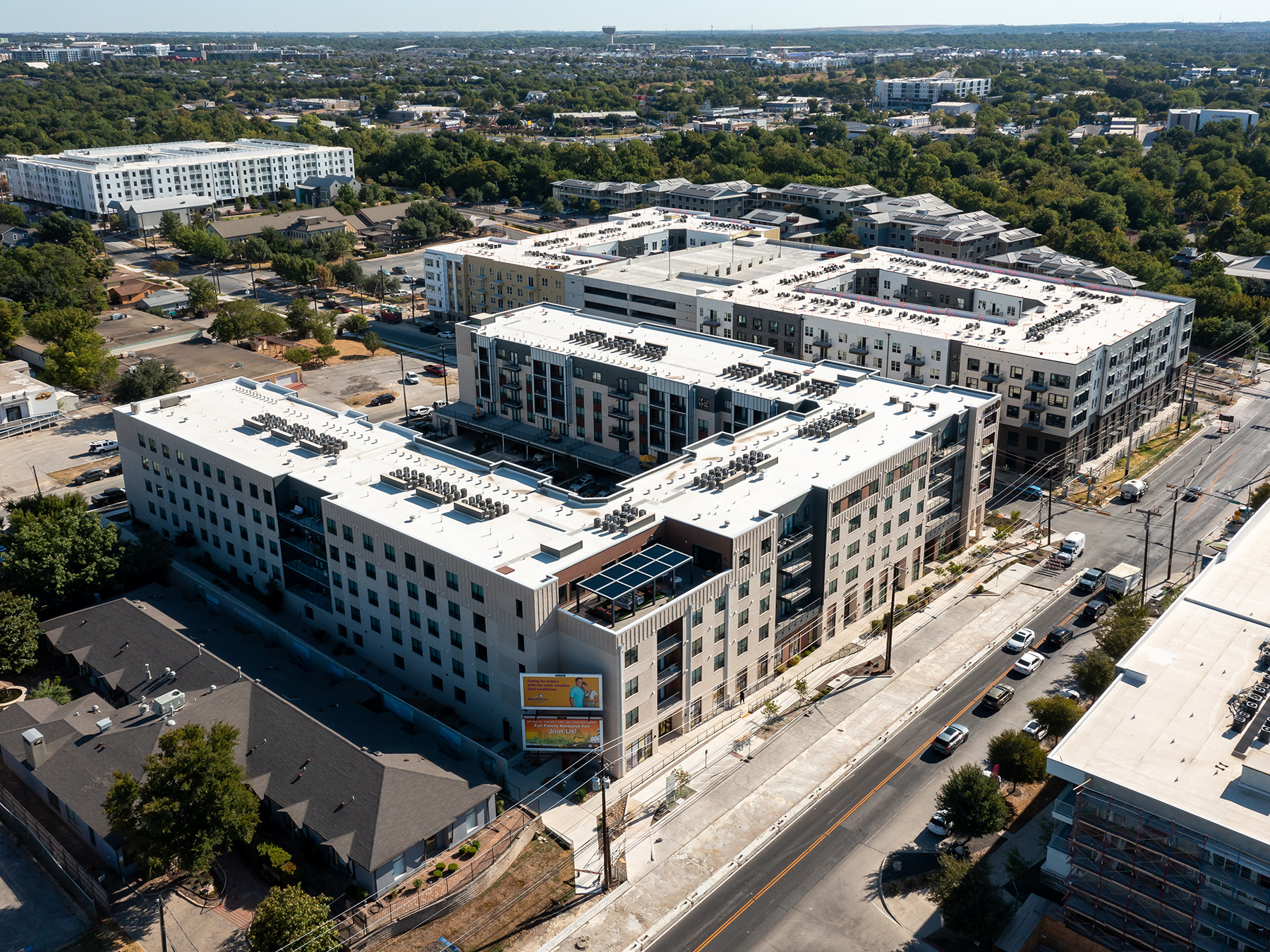 Above the podium, four levels of wood-framed residential construction provide a range of unit types, including studios, one-bedroom, and two-bedroom apartments. Resident amenities are distributed throughout the project and include a shared coworking space, an elevated outdoor terrace, and a rooftop sky lounge offering panoramic views of the Austin skyline.