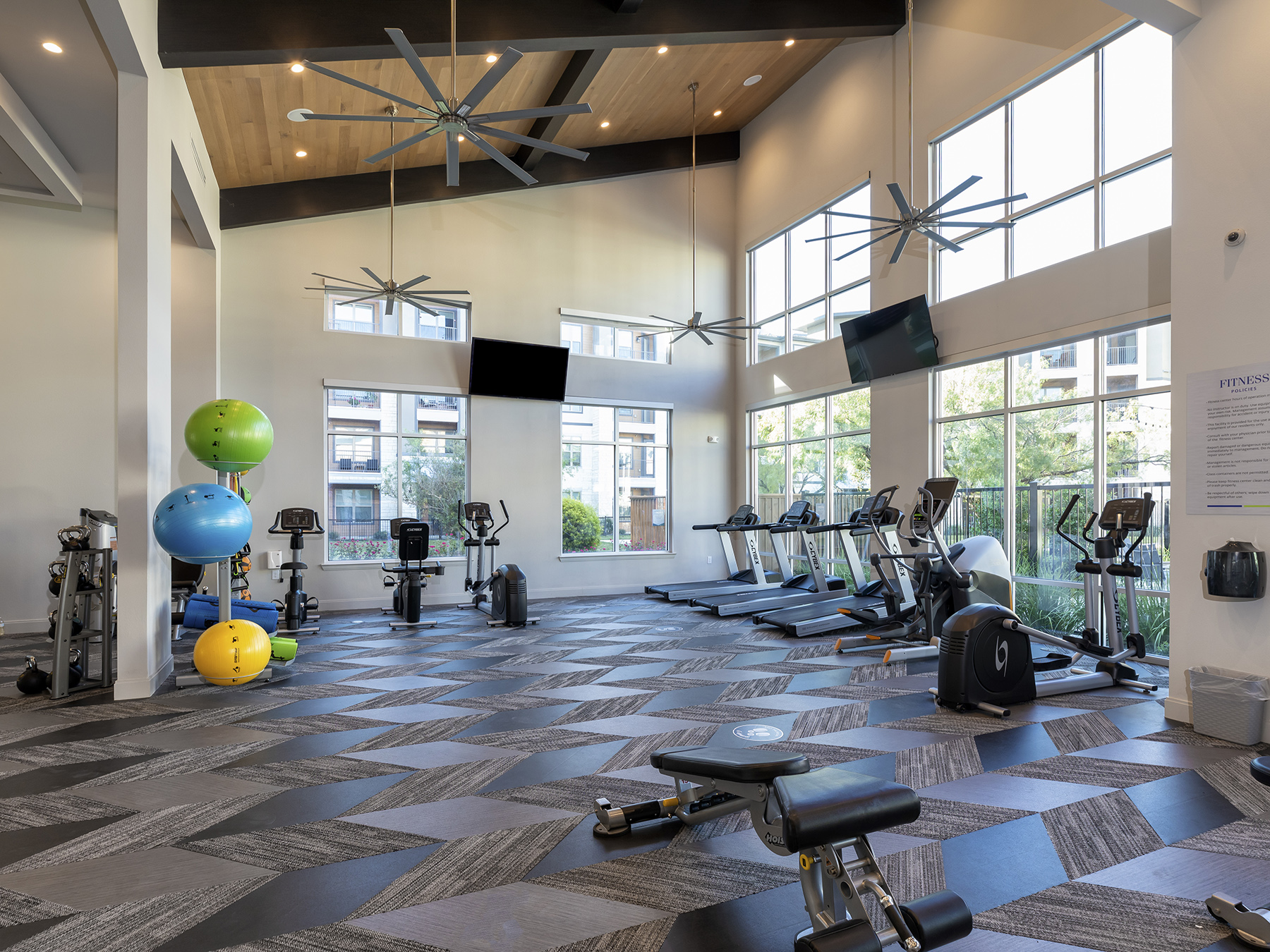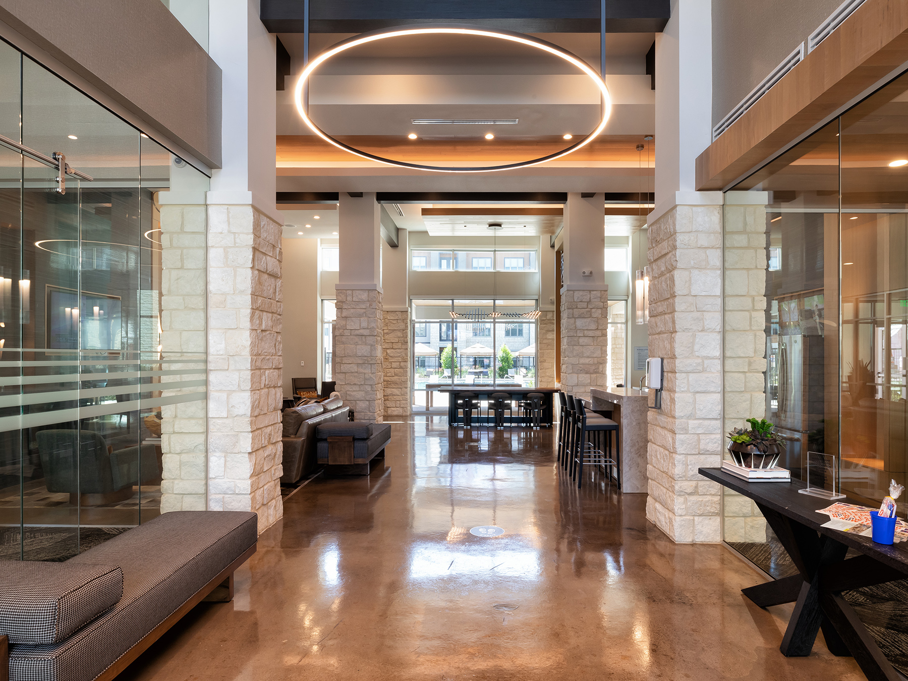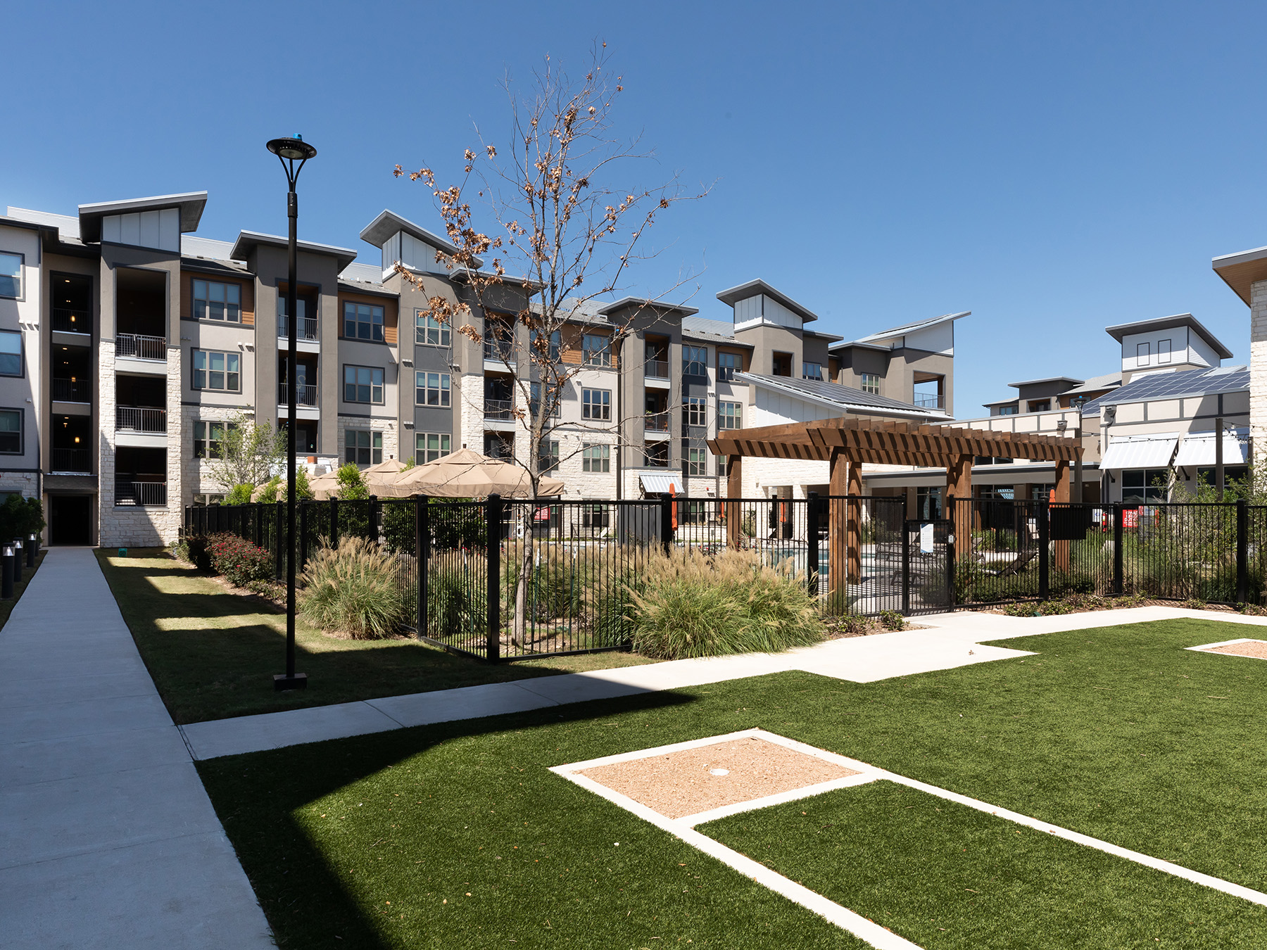 The architectural palette features locally sourced thin-cut natural stone, stucco, and lap siding, with large windows and standing seam metal roofing highlighting tower elements. Amenities, many proposed or refined by HEDK, include an amenitized pool courtyard, a large outdoor patio at the clubhouse, and an open-air dog pavilion with a dedicated dog wash station at the on-site dog park. The clubhouse showcases 15- to 20-foot ceilings, creating a dramatic and inviting space. Solar panels integrated on the multifamily buildings and clubhouse supplement the project’s power needs, enhancing sustainability.