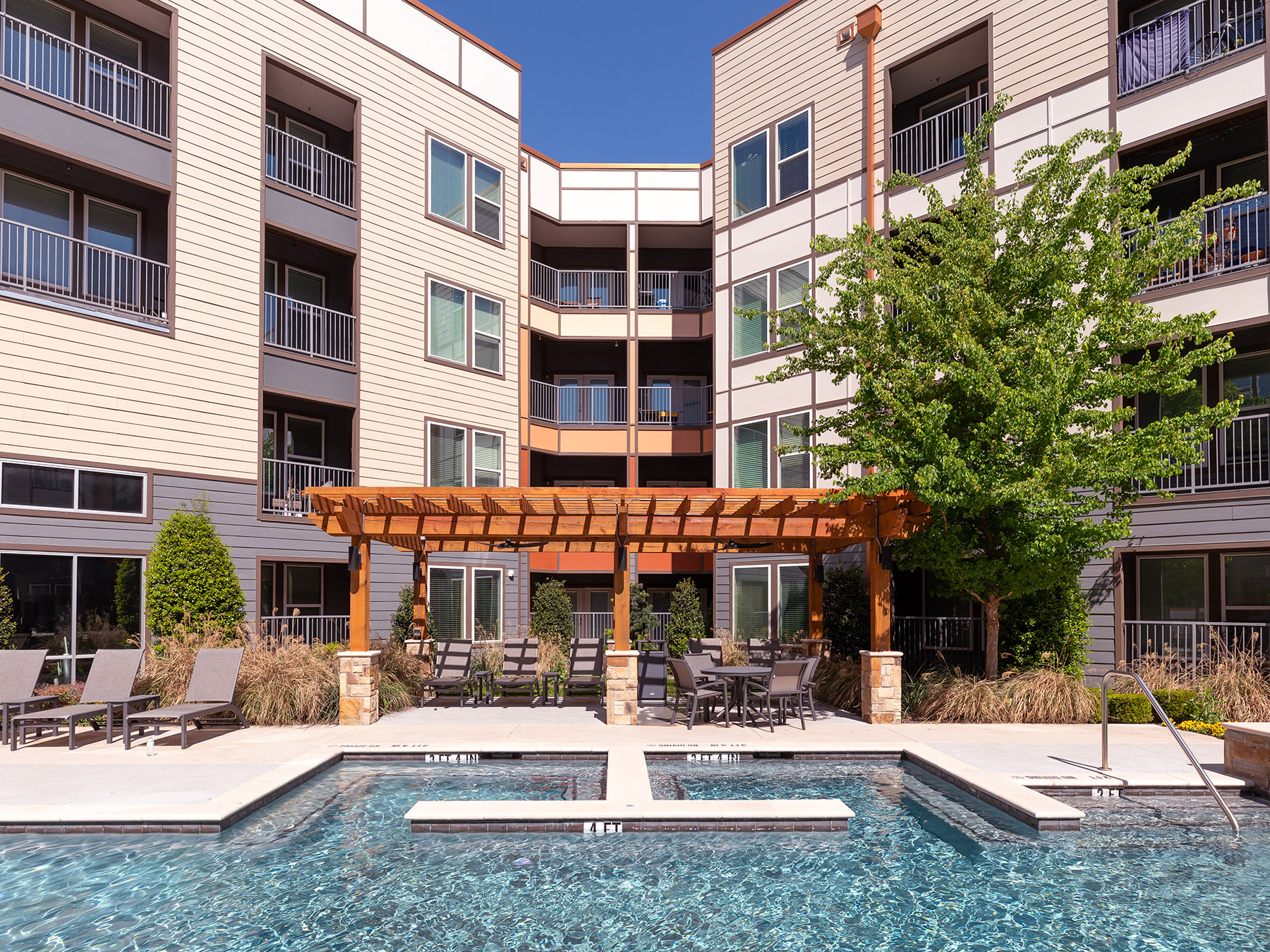 The structure wraps around two courtyards: a vibrant pool courtyard and a second open space facing the Trinity River. A centralized parking garage ensures convenient access to all units, which include a mix of studios, one-bedrooms, and two-bedrooms to suit a range of lifestyles. Despite a challenging utility easement running through the site, HEDK successfully divided the building into two connected volumes, linked by two elevated bridges. A contemporary design featuring fiber cement panels and creative paint strategies delivered a sleek, cost-effective solution that allowed the project to move forward amid a difficult financial market.
