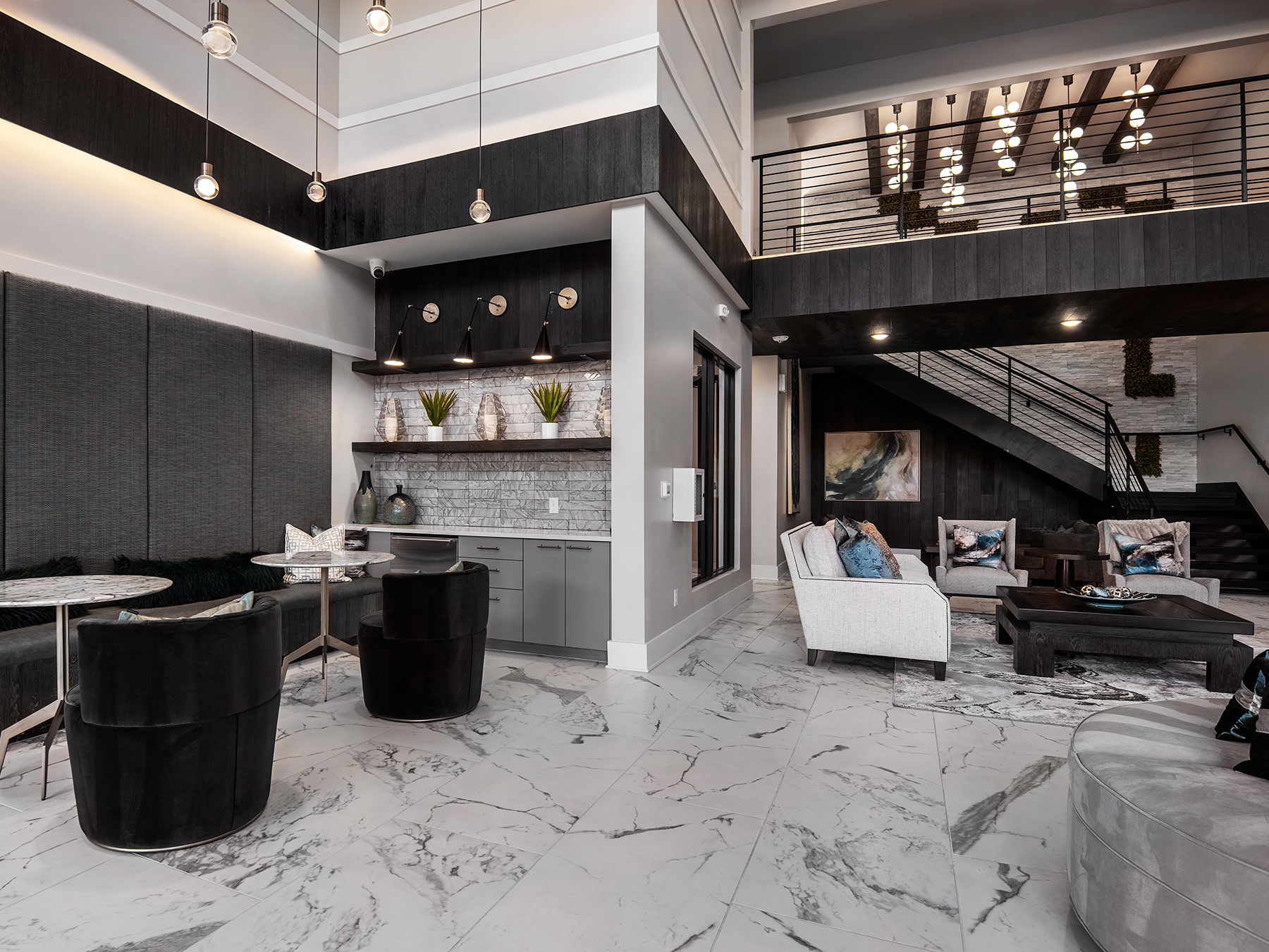Set within a steeply graded site, The Harper’s buildings are carefully integrated into the natural topography, with 4-story garden-style structures and basement levels that create a 5-story street-facing elevation. Varying first-floor ceiling heights respond to changing slab levels, helping provide an efficient use of the land. The grading strategy is also leveraged in the amenity core, where a dramatic double-height space and interior stair connect the elevated pool court to the lower main entry.