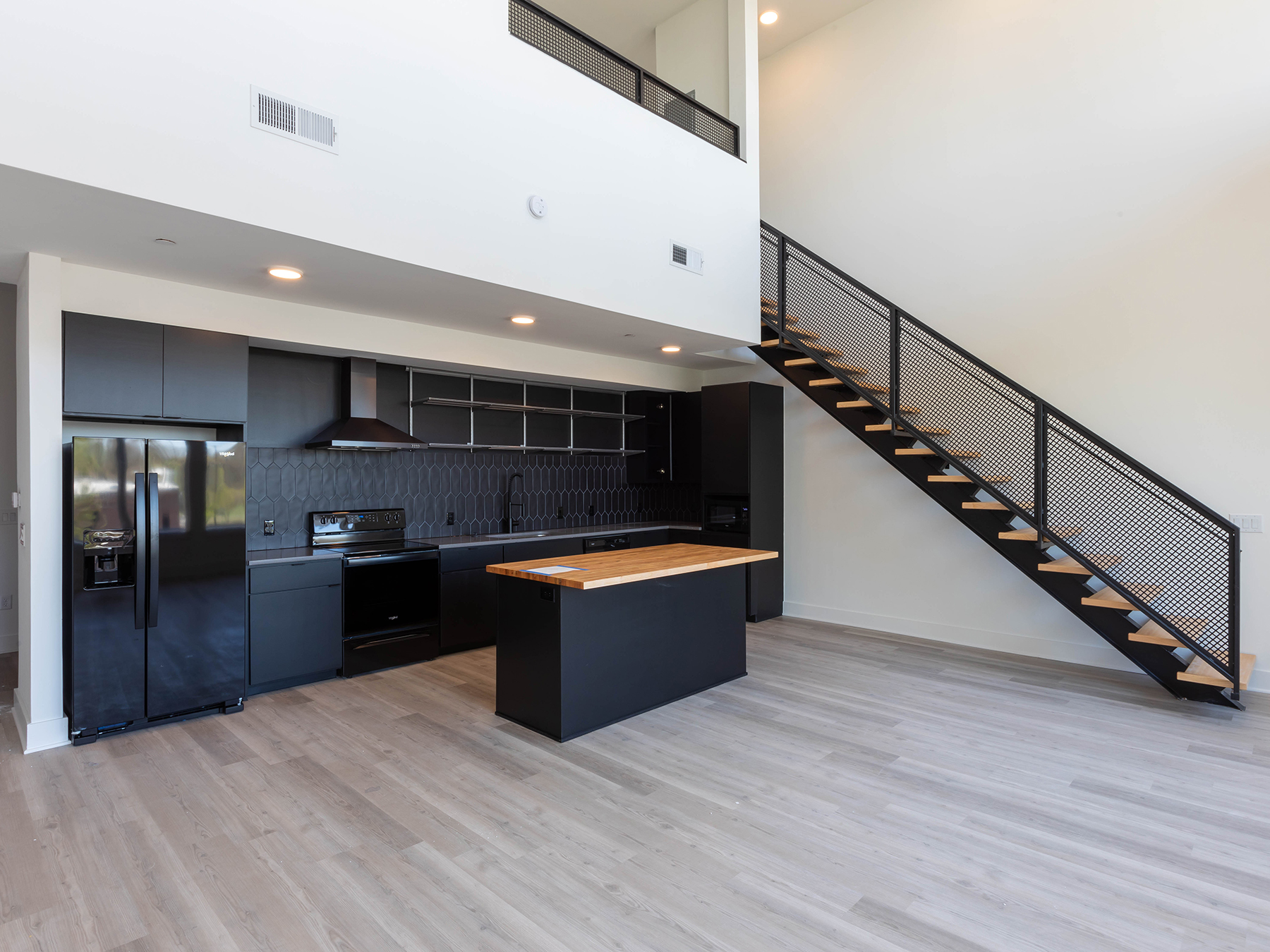 Each one-bedroom residence features floor-to-ceiling windows, butcher block countertops, matte black fixtures, custom tile backsplashes, and Elfa shelving. The top floor includes loft units with double-height ceilings and expansive windows that frame the majestic oak tree at the heart of the development.
