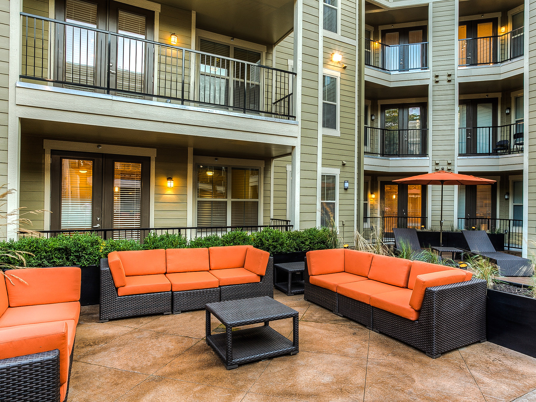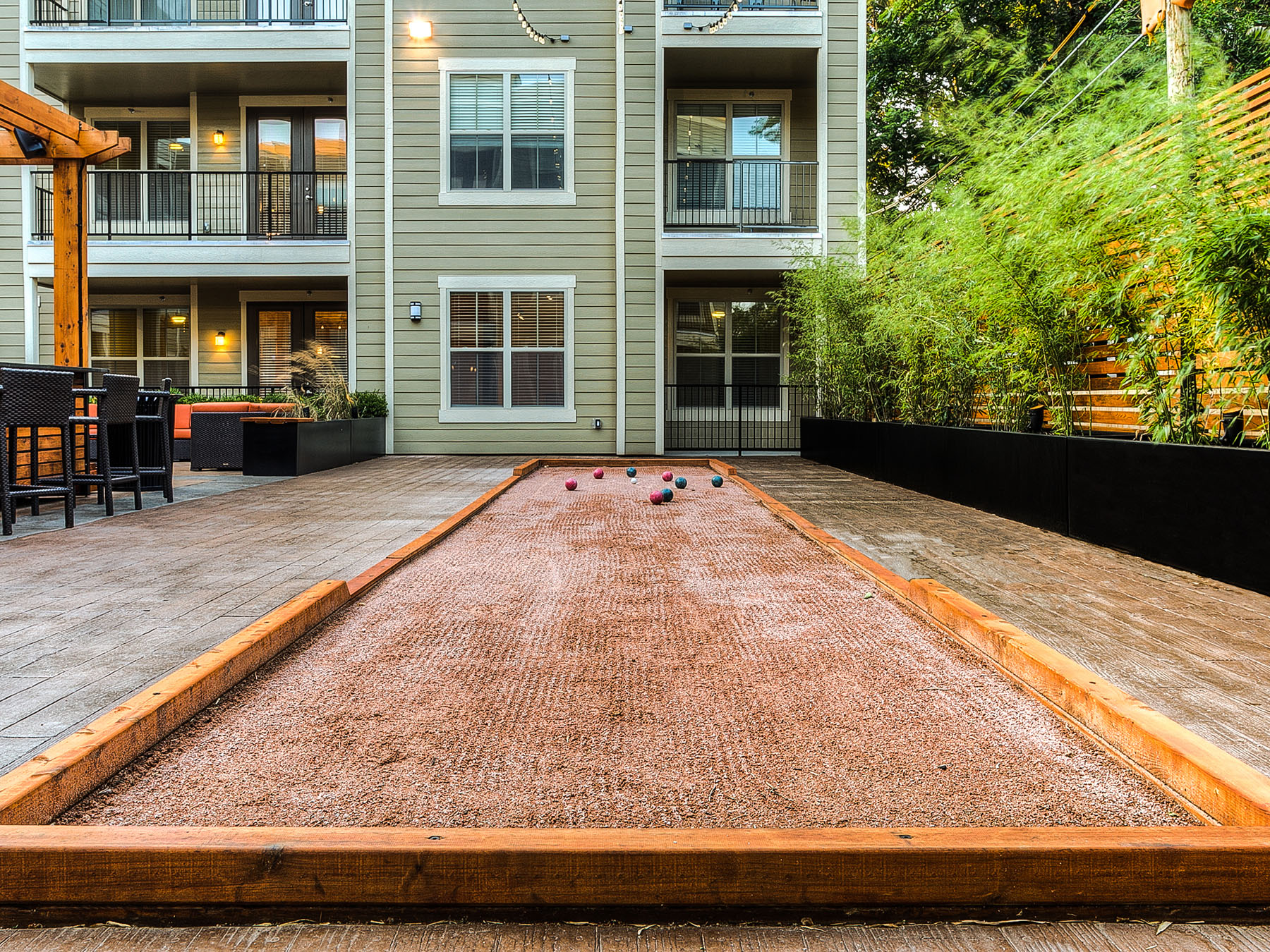 The architecture creates layered transitions between public and private space through a series of outdoor zones, culminating in a landscaped plaza with lounge seating, a grilling kitchen, and a bocce ball court. Unit interiors feature 11-foot ceilings on the ground floor, open layouts, and high-end finishes like granite countertops.